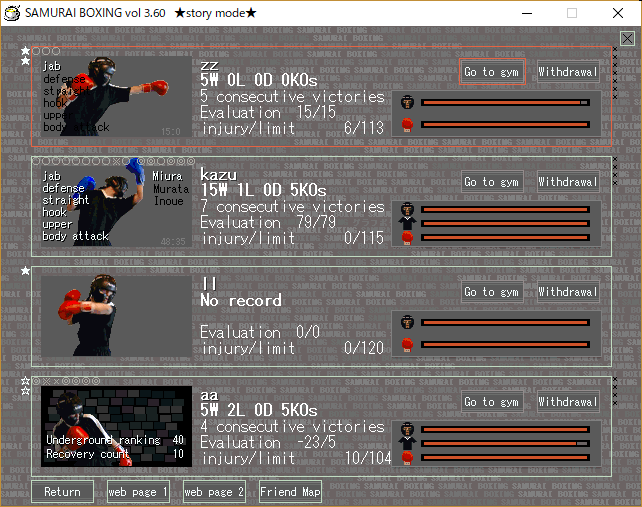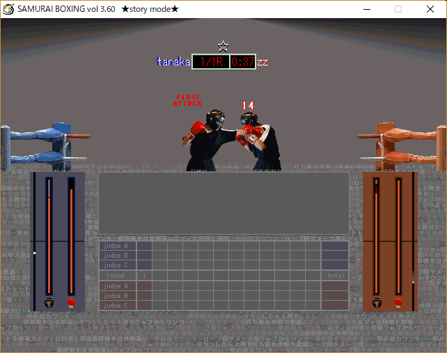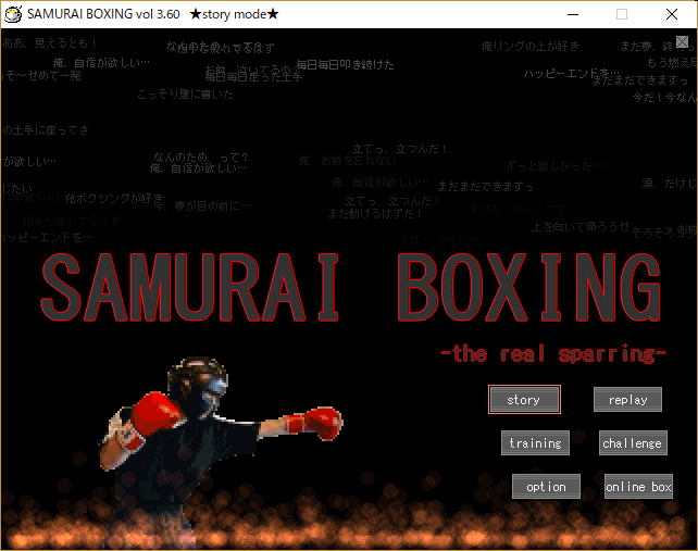 SAMURI BOXING This boxing game is very popular in Japan. Your computer may have some problems on displaying some words if your Windows is English version, because everything is supporsed to be described in Japanese in this game. If you don't care those problems on language, you can play and enjoy this game. But if you try to enjoy real time fighting from overseas, maybe you'll feel it's so slow. Why don't you try? Downlord Here. SAMURI BOXING --> DOWNLOAD ![]() ![]() ![]() Controls: