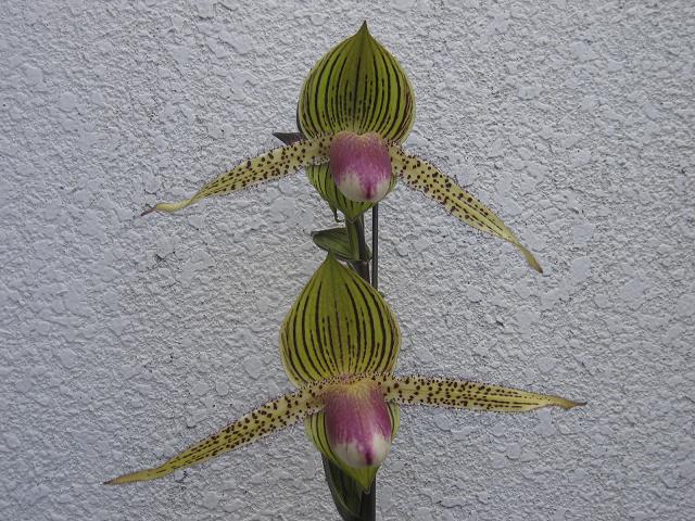Paph. Lebeau 'Ryukyu' AM/OIOS '95 (Transvaal 'Dogashima' x rothschildianum) 1995年第9回沖縄国際洋蘭博覧会(通称・海洋博蘭展)の 大賞を受賞した株。 入賞花続出の堂ヶ島交配 Lebeau で す。画像には写っていませんが、後ろには3輪目の蕾があ りました。 同じ株の別画像を、当ブログの「2006年10月29日」に 掲載しています。