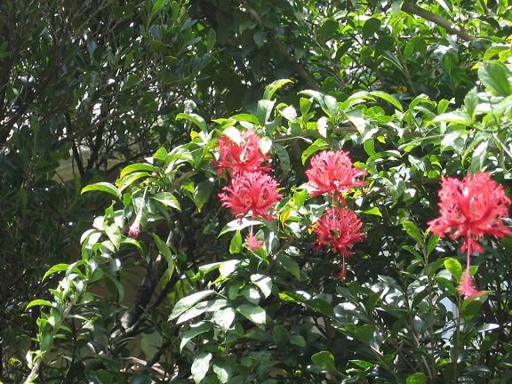 垂れ下がるようにして咲いていたハイビスカス。梅雨が明