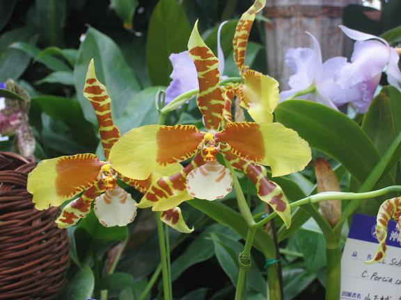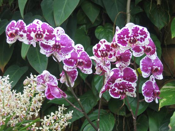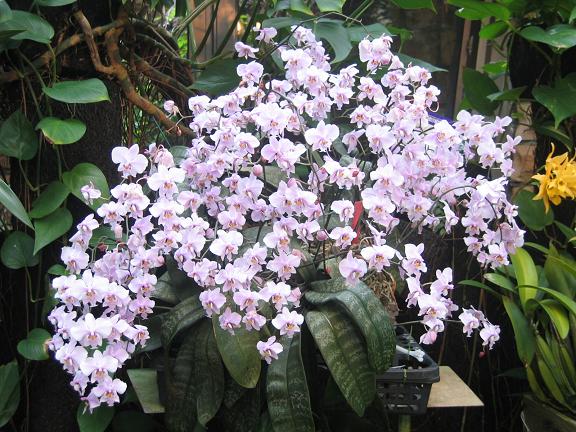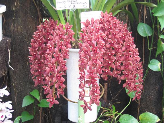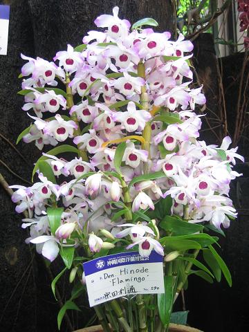 | Den. Hinode 'Flamingo' (Winter Star x Snowflake) 1980年高木?氏の登録 この品種も年末には本州から流れて きますが、沖縄では上のシンビジュー ムと同じく冬の低温が足りません。 |