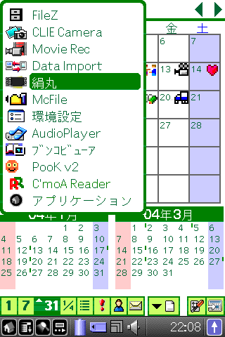 シルクスキン ステータススキン CLIE Organizer 無線LAN Graffiti 動画録画 グループ 便利なカード情報 フォント DAソフト 液晶保護シート ケース ハードリセット エッグ!! ランチャー 電源ボタン変更 ボタン割当変更 動かなかったソフト お気に入りソフト 戻る