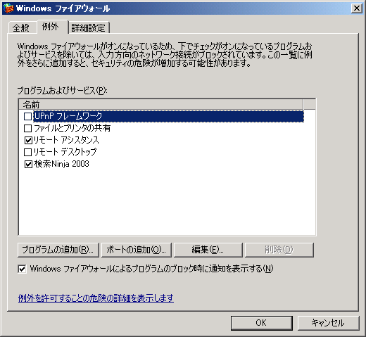 この様な場合、ファイアウォールの「例外」設定で対象となるプログラムやサービスを除く設定を行う必要があり、