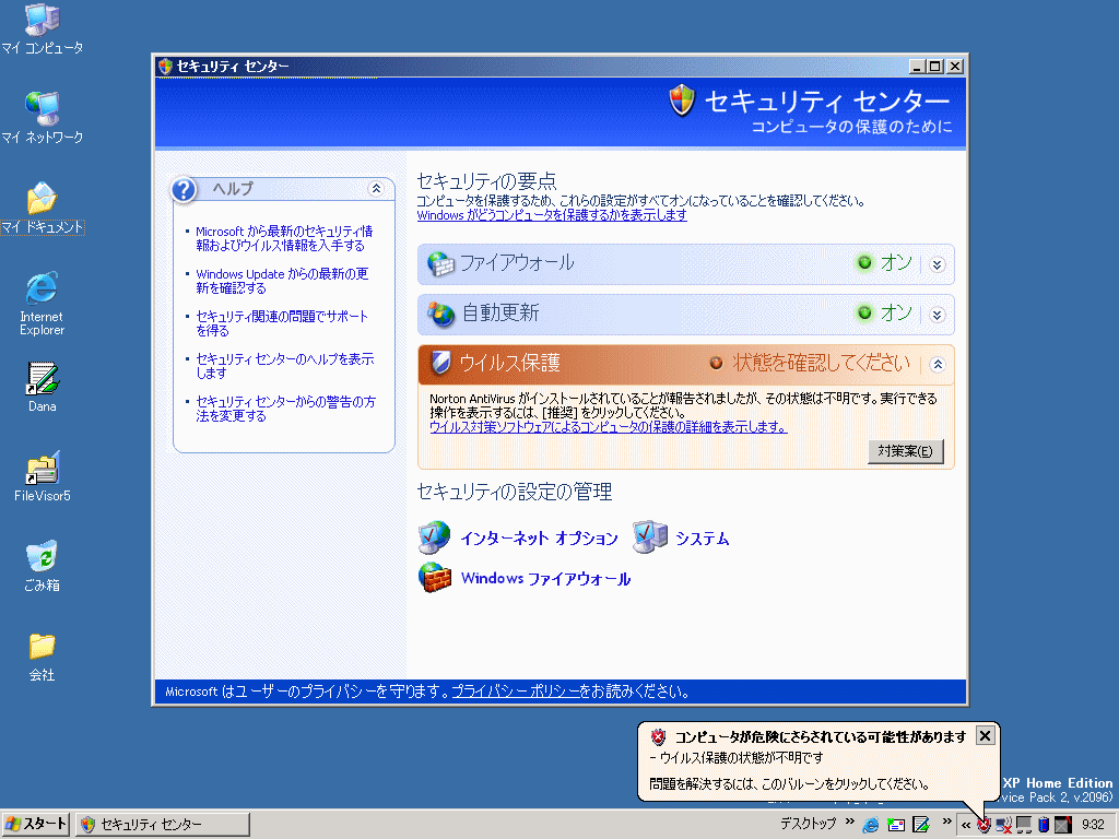 ファイヤーウォールの状態、Windowsの更新状態、ウィルス対策の状態が総合的に管理されています。
