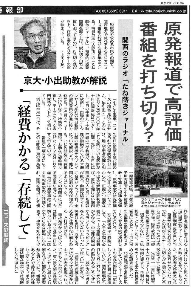 そもそもは、大手メディアとしてまず朝日新聞が8月1日に報道したことから。小出裕章(京大原子炉実験所助教)「たね蒔きジャーナル」存続呼びかけ