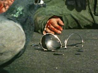 凶悪犯から投げ出されたサングラスに、平和の象徴の”鳩”が近寄ってくる。