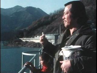 ダムの湖水に向かって、望月源治の遺骨を投げながら、(右の画像)