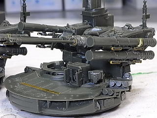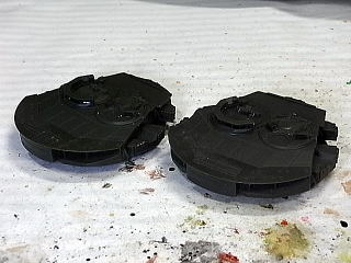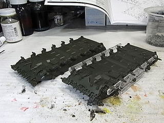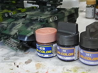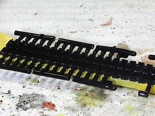 金属部の質感を出したい所に黒鉄色をドライブラシ。