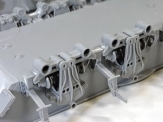 転輪パーツの処理が終わった所でサスに取り付けておりますが、