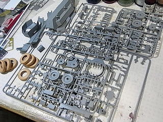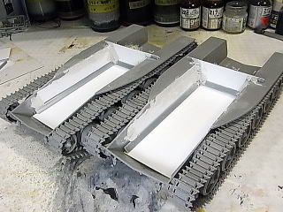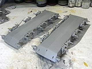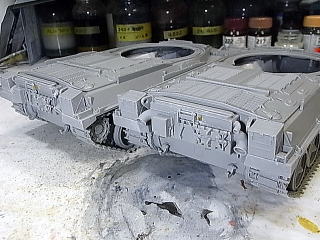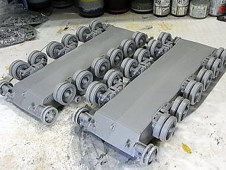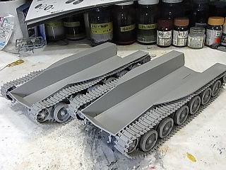 まずはキャタピラやゴム部等に基本色となるジャーマングレイを塗った所ですね、
