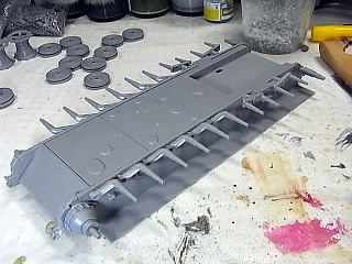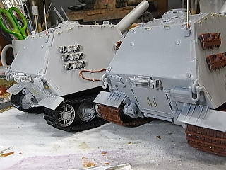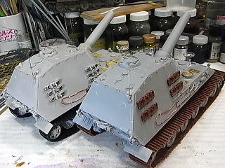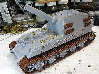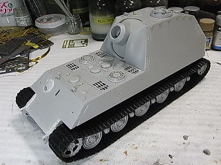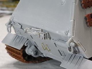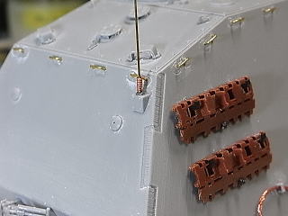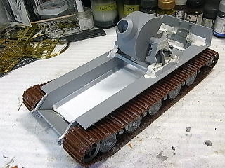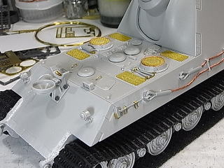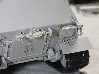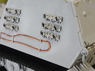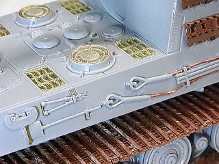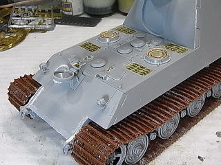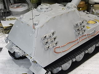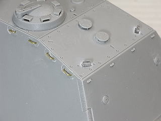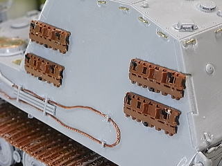 戦闘室側面には余剰履帯をティーガーII風に取り付けてみましたが、