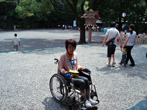 ![]() 参道から本宮前にはスロープが設置されていました。 が、お賽銭箱までは石段が二段あります。よほどコントロールに自身があり、尚、前にどなたもいなければ、ここからお賽銭を投げてもよいのですが、ちょっと困難。 100円玉を持って考えていると、女性が「入れてきましょうか」と声を掛けて下さいました。お願いして、無事参拝できました。かなりばて気味の帰りの砂利道もお手伝いして下さる方がありました。