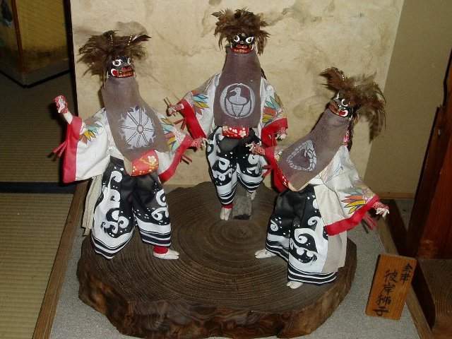 会津地方の豊作と家内安全を祈る伝統行事で、春の彼岸に踊ることから彼岸獅子という。太夫獅子、雄獅子、雌獅子の3人一組で演じられ、頭に獅子頭を被り、鳳凰を染めた着物を着て笛と太鼓に合わせて踊る。(滝沢本陣の彼岸獅子)