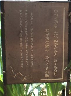 | 其の1は左上のチ「沖遠く入日の影をしたふまに・・・」からである。右側の解説で下に「」書きしてあるのは歌の出典である。歌碑の周りは綺麗に清掃され、碑の前に物が置いてあるなどは皆無であった。 |