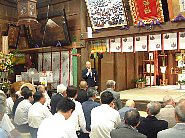 | ご挨拶される牧野忠昌さま | 神社前で記念撮影 | 繰り出した神輿 |