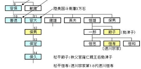 | 戊辰戦争で会津23万石は没収され、松平家の再興が許されたのは明治2年のことである。しかし、斗南藩3万石は陸奥国の北端の寒冷地であった。 系図から見た会津松平家の明るい出来事は、松平容保の子息の恒雄氏の子の節子さまが秩父宮親王妃となったことと、一郎氏の子の恒孝が徳川宗家を継いだことではないだろうか。 昔の皇室は、華族以外の婚姻が許されてなかったので、勢津子妃は保男子爵の養子として嫁いでいる。 |
