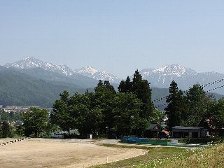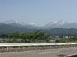 | 遠ざかる越後三山、左から越後駒ケ岳(2003m)、中ノ岳(2085m)、八海山(1778m) | ||