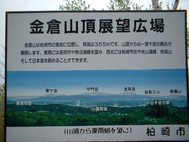 | 金倉山から後ろの日本海側を見ると、長州毛利家先祖の地「佐橋の庄(佐橋荘)」北条(きたじょう)、南条、安田条はすぐ下に、そして勝海舟先祖の出身地である長鳥(ながとり)は北側に見下ろせる。信越本線が通り、「長鳥」、「北条」、「安田」の駅名が続く。 |