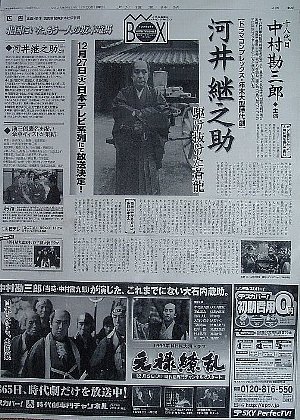 | 読売新聞11月28日の夕刊に、河井継之助「駆け抜けた蒼龍」放送予告の全面広告が載った。 12月27日(火) 夜9:00〜11:24 日本テレビ系列にて放送 出演: 十八代中村勘三郎 唐沢寿明/稲森いずみ/中村獅童/伊藤英明 京野ことみ/田畑智子/松嶋尚美/吉田日出子 佐野史郎/吹越満/火野正平/田中実 北村和夫/淡路恵子/神山繁/六平直政 中村勘太郎/中村七之助/荒川良々/笹野高史 渡辺えり子/高知東生/石橋蓮司/坂東三津五郎 ほか |
