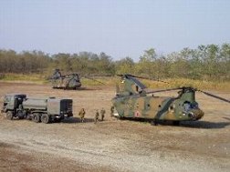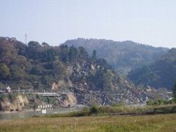 | 司馬遼太郎『峠』記念碑付近から朝日山、榎峠、妙見の古戦場を見る。右に崩落事故の救助でオレンジ色の無人ショベルカー活動中 | 左写真の信濃川の河川敷(高梨)には自衛隊が駐屯。山古志に向けて大型ヘリが次々と救援に飛び立つ、まさに戦争の様相 |