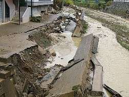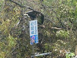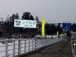 | 小千谷市の浦柄橋から見た崩落現場 | 落下した長岡市の標識、ここから妙見 | |