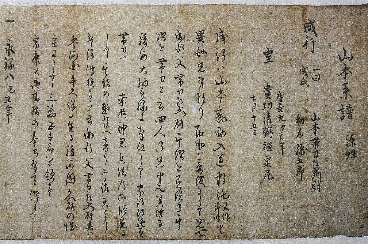 | 長岡市の中央図書館文書資料館に、注目すべき文書がある。永禄8年(1565)の山本系譜で山本成行の異母兄に勘助の存在を記述している。勘助は永禄4年(1561)の第4回川中島の合戦で亡くなるので、そのわずか4年後の文書となる。 |