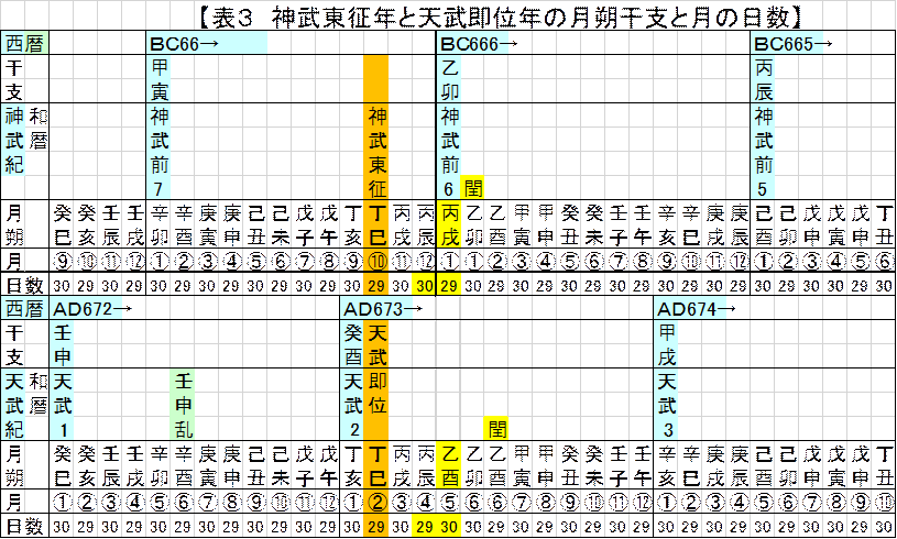 水野惟之氏は、日本書紀の月朔干支は中国暦でない日本固有の暦とする考えに賛同しておられた。その中で、表3のように、最初の干支日付記事となる神武東征年二月朔と天武即位二年十月朔が同じ「丁巳」であると指摘した。しかも八年先、天武十年四月まで、神武紀と同じ月朔干支が続いているとある。つまり、60年干支は循環数なので、この期間は六〇日の倍数で結び付いている。日付干支もすべて同じ干支になる。ただ、儀鳳暦で計算すると、神武紀の干支記述がないときに若干のずれが生じている。