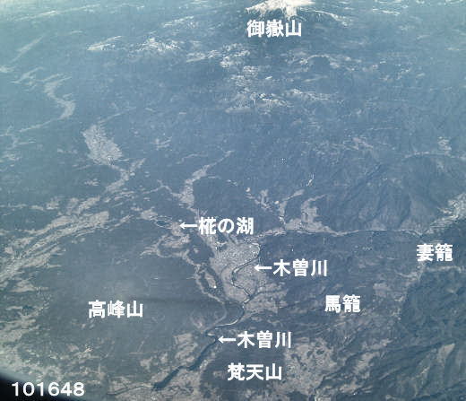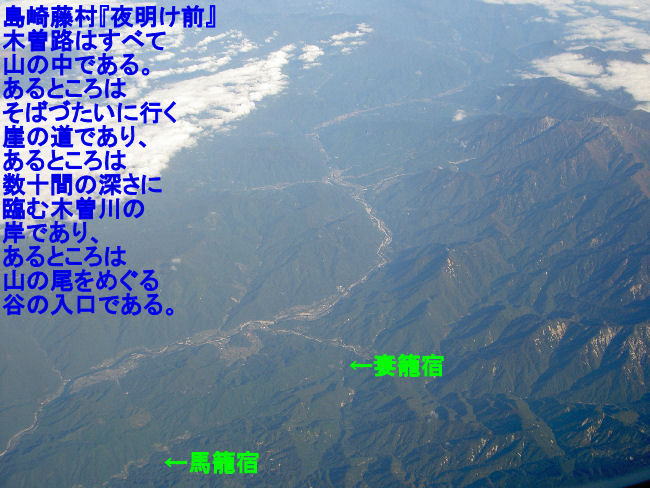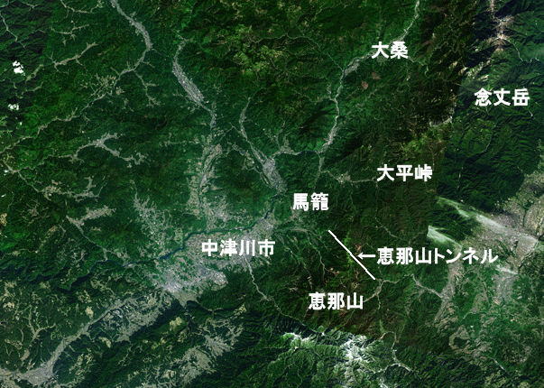 11中津川市高峰山(画面左下)、木曽川(画面中央)、馬籠宿(画面右下)一帯