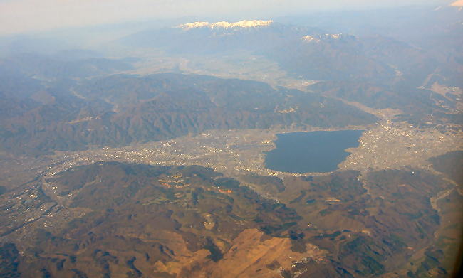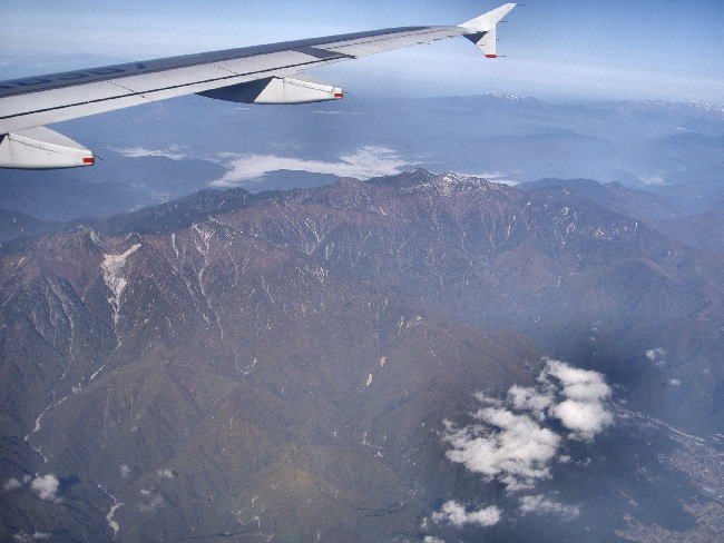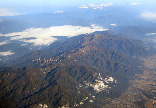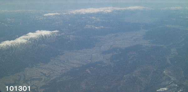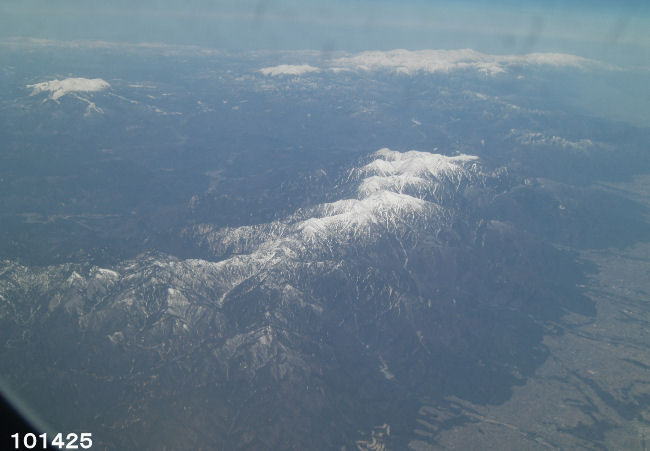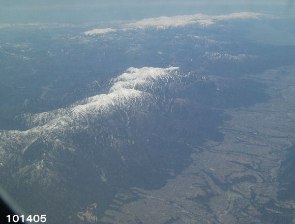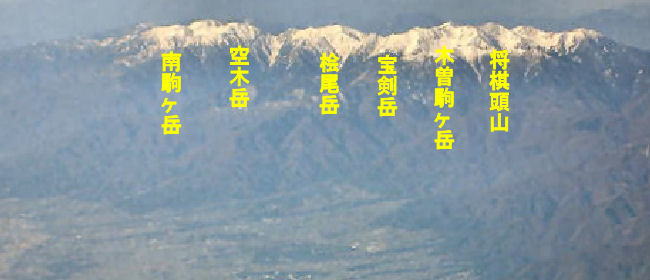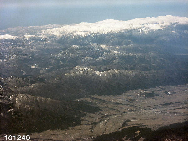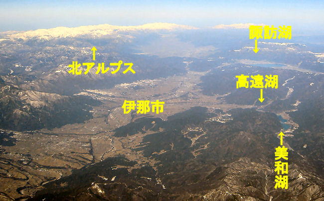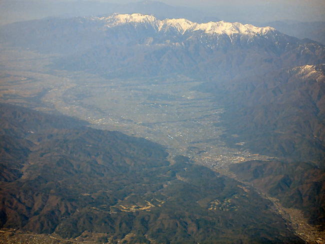 2中央アルプス(画面左)と北アルプス(画面上部中央)と伊那谷