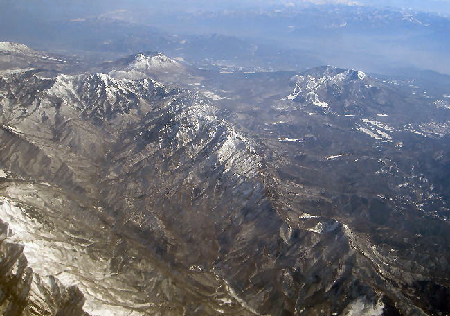 1松本平上空から見た乗鞍岳と御嶽山