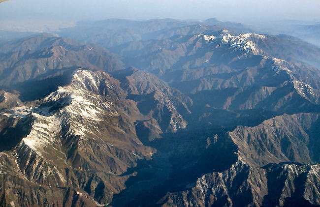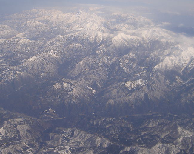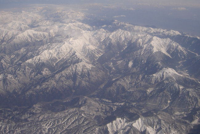 23北アルプス(画面上)と中央アルプス・伊那谷:伊那谷南部上空高度約12,000米から撮影