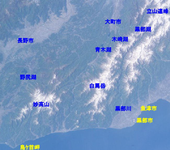 16妙高山−白馬岳−黒部湖一帯(NASA衛星画像)