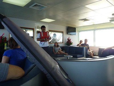 本当は外の客席でもよいのですが、航行中風が強いので。