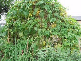ゴーヤはごらんのとおり蔓がからみあって山のようですもう少しでシーズンも終わりかな?