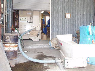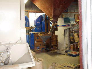 青い機械が玄米にする「籾摺機」白く縦長のものが玄米をくず米と篩い分ける「ライスグレーダー」