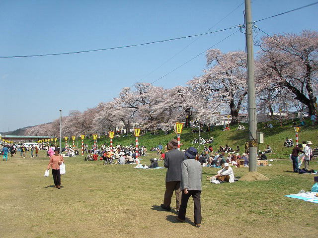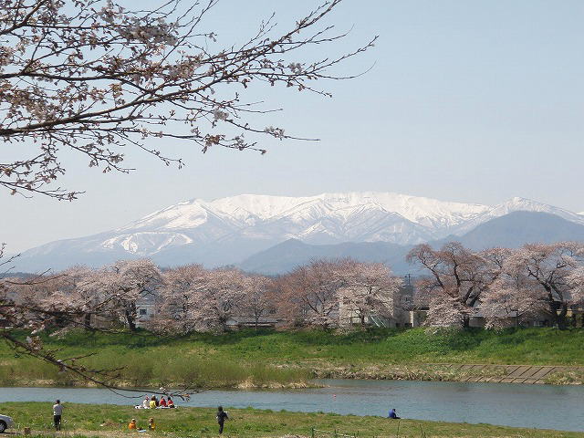 残雪の蔵王にピンク色に染まる白石川堤の桜