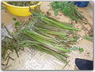 採ってきたわらびは、長さを揃えて輪ゴムで束ねます、大きなタライに並べて灰をかけ、沸騰したお湯おかけ一晩置くとアクが抜けます。