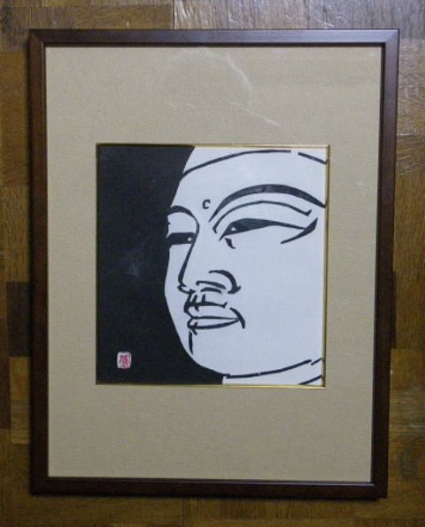 大日如来像です。この作品は、濃い黒墨と薄墨を使い木版で摺り上げました。それをコピー機でコピーし、CGで色付しました。紙は和紙を使い印刷機で打ち出しました。これも、旧木版画と現代のCG技術のコラボレーションです。江戸時代の浮世絵の模倣ではなく、現代の版画を作り出すべきでしょう。この作品はそうゆう意味では、過渡期の作品でしょう。皆さん工夫しましょう。