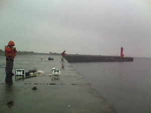 | ミスターKと、「12時の船で揚がろうか」、とひそひそ話をしていたら、 先端内側で頑張っていたくらさんがやってきた。 どうせ「あっちもダメ」という報告が待っているんだろう、そう思っていた。 「シマアジ釣れてるよ。」最初ぼくにはそう聞こえた。 でもよく聞きなおしてみると「シマアジ釣った、この前の鵜渡根のより全然でかいよ。」 ということらしい。とりあえず他人事のような感じでよくわからないので、ブツを見に行くことに。 「みんなであっちでやりましょうか」という話になったときには既に、 ぼくは自分の竿とコマセを持って先端方面に向かって歩き始めていたらしい・・・。 |