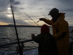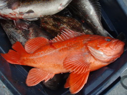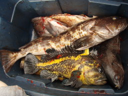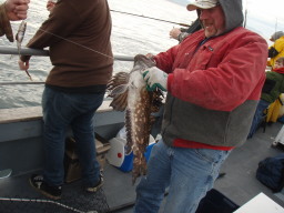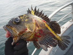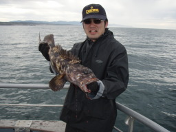 | アラスカやオヒョウがいる海域まで行けば人の背丈ほどの化け物もいるらしいが、ここで上がるのは最大1m級か。 ロックフィッシュはどれも40cm級だ。一際重たいアタリ、しかし、45cm級のロックフィッシュがダブルであがってきた。 この何が浮いてくるのか、ワクワク感がたまらない。しかし、そこは釣人の悲しい性、既にリンコッドしか視界に入っていない。 ベテラン風で、自分のタックルを持ち込んでいる釣人が、次々とリンコッドを掛ける。じっくりと観察させていただく。 そして真似てみる。ロックフィッシュはもう十分にキャッチした。リンコッド、リンコッド、オレにもリンコッド、 と心の中でつぶやきながら誘いを掛けていく。 仕掛けを海底に落とした直後だったとおもう、一際重たい魚心が伝わってきた。 呼吸を止めるように、ゆっくりとゆっくりと巻き上げていく。リールは逆転。クルーがタモをもってかけつけてくれる。 ついにやったか、ついにやったか、頼むから外れないでくれ、祈りながらリールを回す。 安物の竿とリールはなかなか味がある。 あの子供の頃に安い3.6mの釣竿で大物を掛けた時のような素朴なハラハラ感がある。 そして茶色いシルエットが浮いてきた。リンコッドだ。うれしさのあまり叫んでしまった。 |