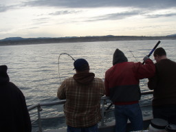 can make me satisfied. I booked another charter, Captain's Charter, by accident. There, fishing gears are different from the other one last time I used: light stick, spining reel and vinyl bait, and the anglers here look more veteran than the other one. Some of them bring their own gears. This one seems better for me. 「式根島とオレゴン、今週末は同じ太平洋で釣りですな。」 くらさんとそんな会話をしていたのはつい数日前のことだ。 敢えて彼の企画を引き継いで式根を決行しようとしたダルマさん、M先生、気まぐれな春先の天候か、 くらさんが「オレをおいていくな!」と言っているのか、 風速15mの大西に阻まれ、式根組は断念。 さすがの大西も太平洋を越えてここまでは来ないようだ。突然の追悼釣行となってしまったが、 くらさん、そして断念した2人分の思いとともに、アメリカ西海岸ニューポートへ向かった。 |