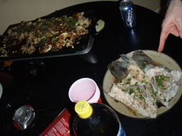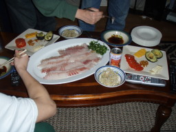 | Dinner party, 20 guests from 8 countries. Cabezon's taste is amazing. 8カ国から20人集まり 盛大な酒宴。 キャベゾンの味は、ヒラメ系。 リンコッドは刺身と酒蒸しに。 醤油ベースの寄せ鍋はどの国の人 にもウケがいい。 |