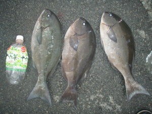 | (仕掛け) Gチューン3号、道糸、ハリスともに6号、3Bのウキとオモリ、小磯11号 (エサ) オキアミ4枚 (教訓) ・時合いは短い、釣りまくれ。 ・使いやすい6号道糸と夜釣りのウキをえらべ! ・ヘッドライトの電池、新しいものを ・手元の作業はペンライトが使い勝手よし(海を照らさなくてすむ) ・荷物の軽量化はできないかな? ・防虫ネットは帽子とセットで使うこと |