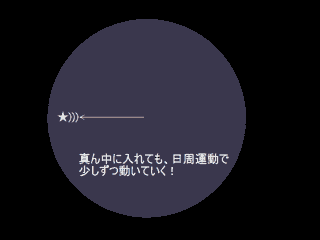 実際に望遠鏡をのぞくとわかりますが、望遠鏡を固定していると、星はゆっくり動いていき、ほんの数分で視界の外にズレて見えなくなります。![]() このため、経緯台で長時間じっくりと観察を続けたい場合は絶えず高度軸と方位軸の2つの軸を微動ハンドルで調節しながら追いかける必要があります。