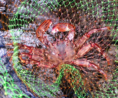 | 今回の釣行ではこのカニを沢山見つけた。大きいヤツで甲羅が大人の拳くらい。なんてカニか知らないけれども、コイツを追っているのかタコがテトラの間を泳いでいくのも見た。ちょっと不思議な光景だった。 |