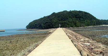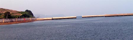 まずは港の偵察。防波堤がそのまま駐車スペースになっているけれども、足元はけっこう深そうだ。外海に面したところは遠浅のゴロタ。目の前に島があるけれども、島との間は人工の狭い水路になっており船が出入りしていた。河口の沖には防波堤があり、それを支える橋脚部分はなんともそそられる。穴撃ちしたらシーバスが2,3本出そうだけれども、そこへ行く道がようわからん。