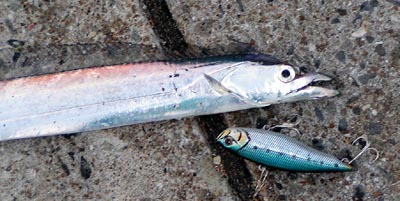 水面直下のミノー。タチウオヒット。