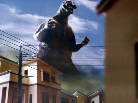 講座課題の住宅模型を使用(口頭にて使用許可をいただきました)。 ゴジラは自作ではなく市販のソフビ(酒井ゆうじ氏原型、初代ゴジラ)。 空と電柱はご近所の実景、電線と煙は手描き。 G−maさんの特撮&怪獣ネタ専門サイトMPWに投稿した画像をG-maさんのご厚意で再録しました。 パースがそろってないとか、窓に余計なものがうつりこんでるとか電柱に違和感ありすぎとかとか・・・いろいろあるんですが、Paint Shop Proを使ったはじめての合成画像なので出来はさておき愛着のある一枚だったりします(^^)。 個人的にはゴジラの肘にあたってる光がみょーに好き♪ |