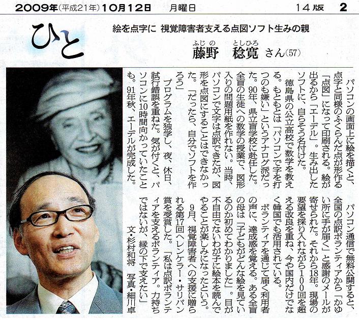 先月の29日、私は東京ヘレン・ケラー協会から「ヘレンケラー・サリバン賞」を与えられました。 この賞は、視覚障害者の支援で功績のあった者に与えられるもので、私が「エーデル」を開発し改良を続けてきた こと、そして、それを無料で提供してきたことが評価されたのだと思います。 しかし、「エーデル」がここまで成長してこられたのは、私一人の力ではなく、「エーデル」を実際に使っていただいて たくさんのご意見を寄せていただいた点訳ボランティアの方々に負うところが大きいことは明らかです。その意味で、 今回の受賞も、私は苦労の多い点訳ボランティアの活動に日々献身しておられる皆様の代理だと考えています。 改めて、「エーデル」をご利用くださっている皆様に、感謝の気持ちでいっぱいです。本当にありがとうございました。 今回の受賞については、事前に徳島新聞と毎日新聞で大きく報道された他、9月30日には赤旗で、また、10月 12日には朝日新聞(全国版)の「ひと」欄(下の記事)で紹介されました。 |