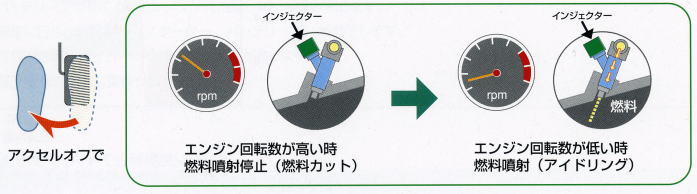 アクセルオフで走行中、エンジンの回転数が高い場合は自動的に燃料の供給が停止されます。