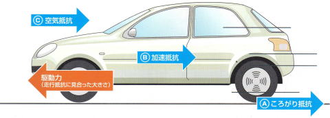 走行抵抗((ころがり抵抗、加速抵抗、空気抵抗など)が増えると、より大きな駆動力が必要となり、